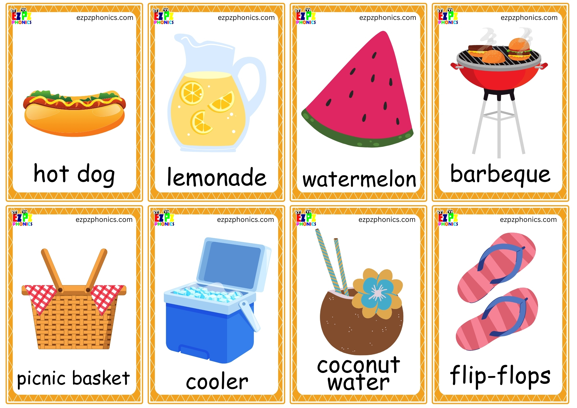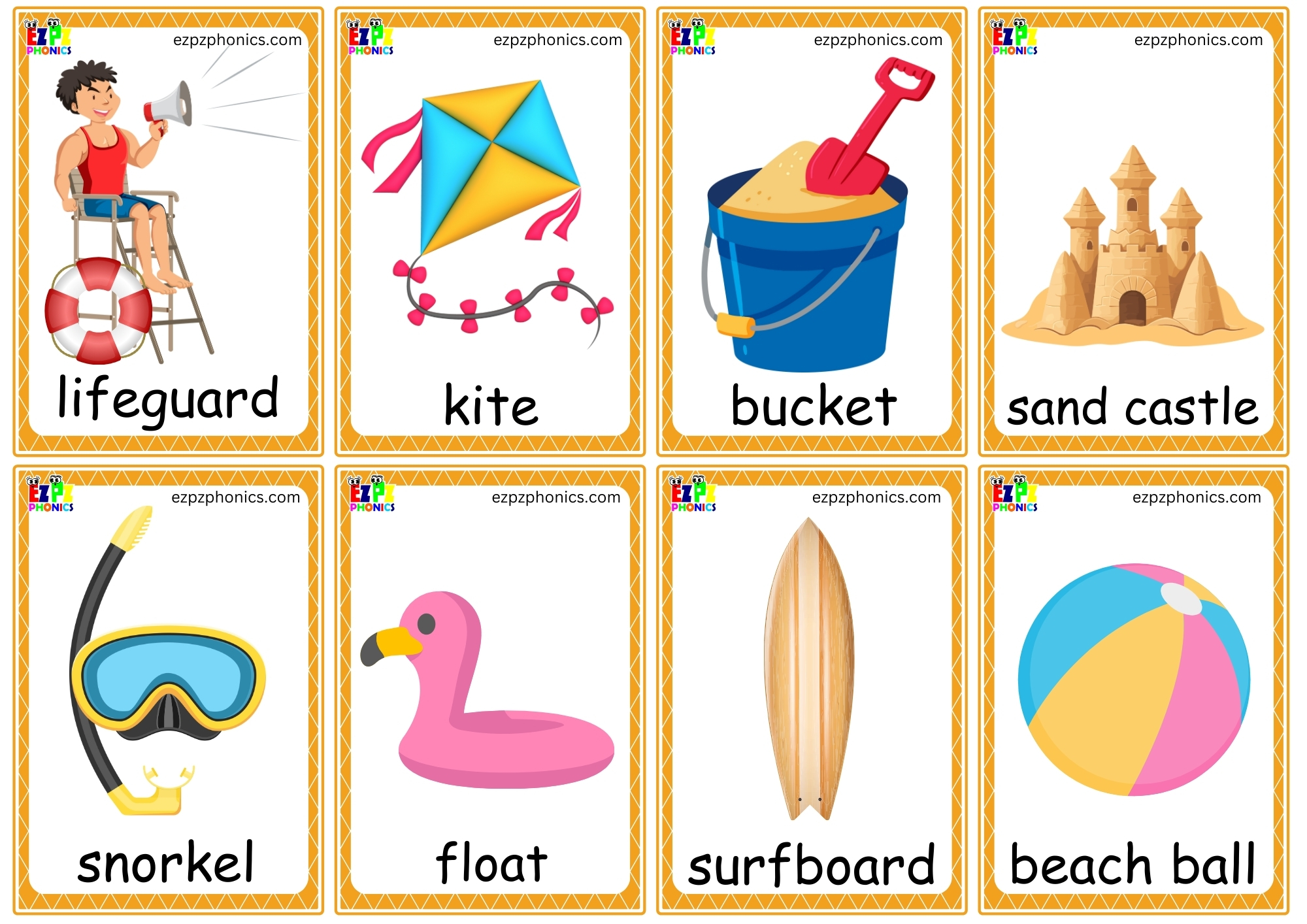 - Summer & Beach Vocabulary: Includes fun terms like surfboard, sunscreen,