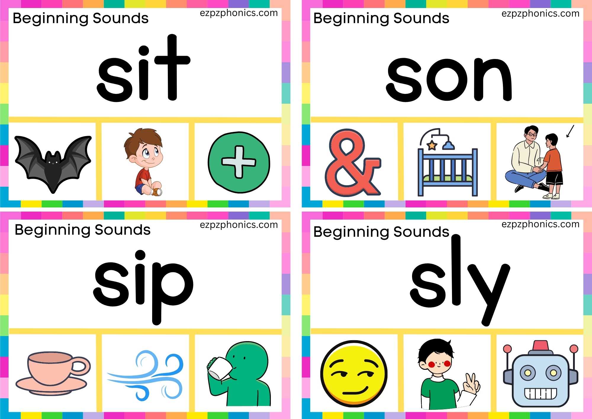 - Includes 4 Clip Cards: This set includes 4 clip cards featuring the words "sit," "son," "sip," and "sly," providing targeted practice for words beginning with the letter S.