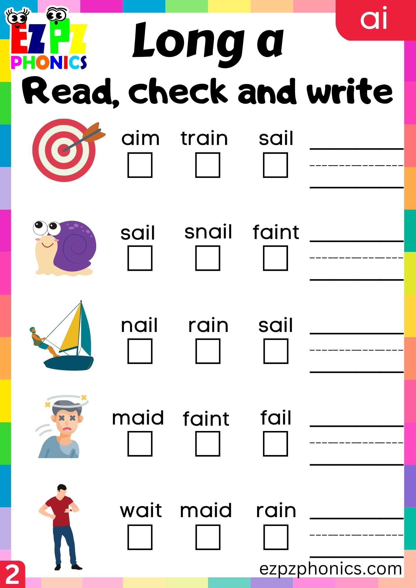 Group2 AI Words Read, Check And Write Long A Phonics Worksheet