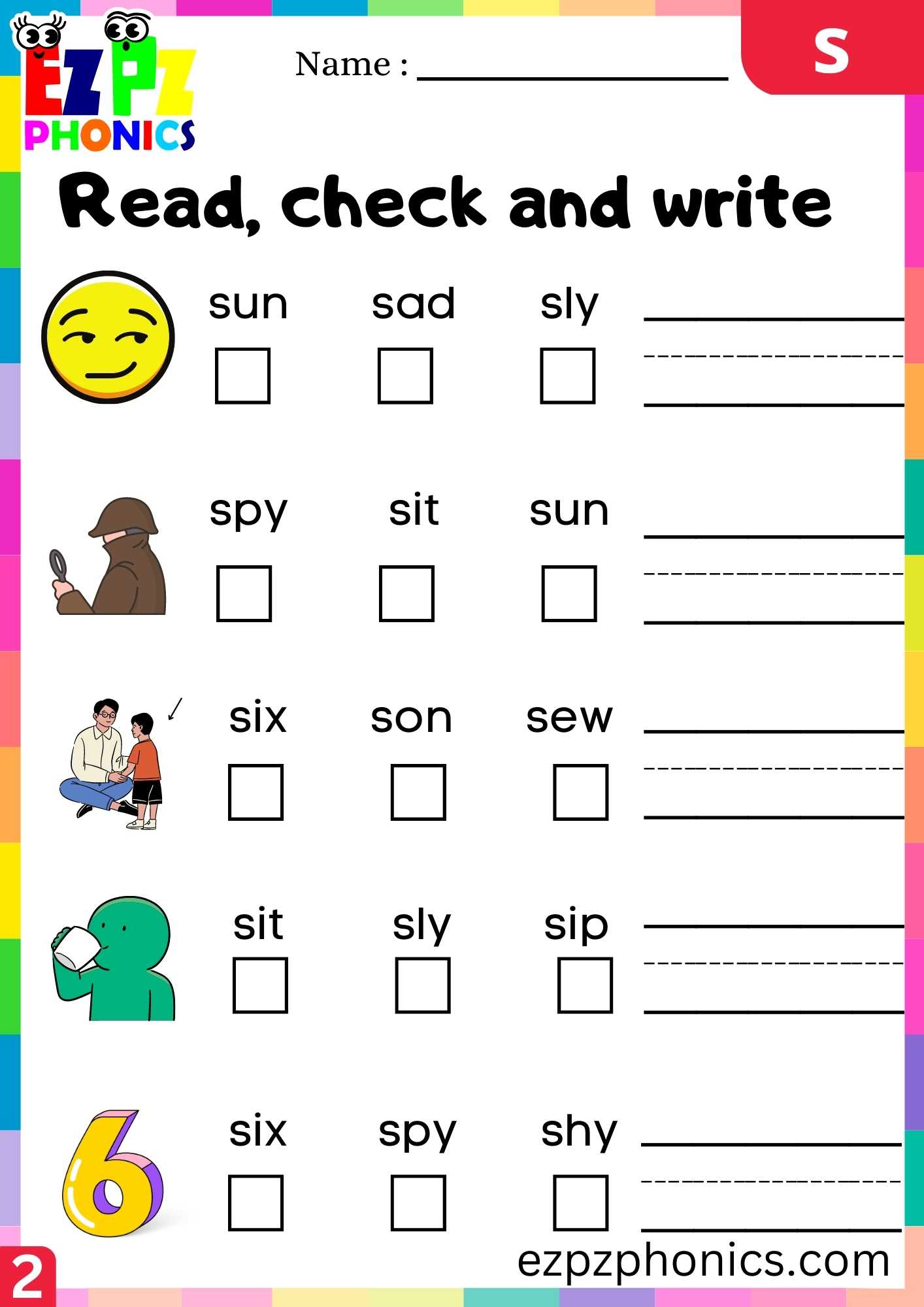 Group2 Letter S Read, Check And Write Beginning Sounds Worksheet