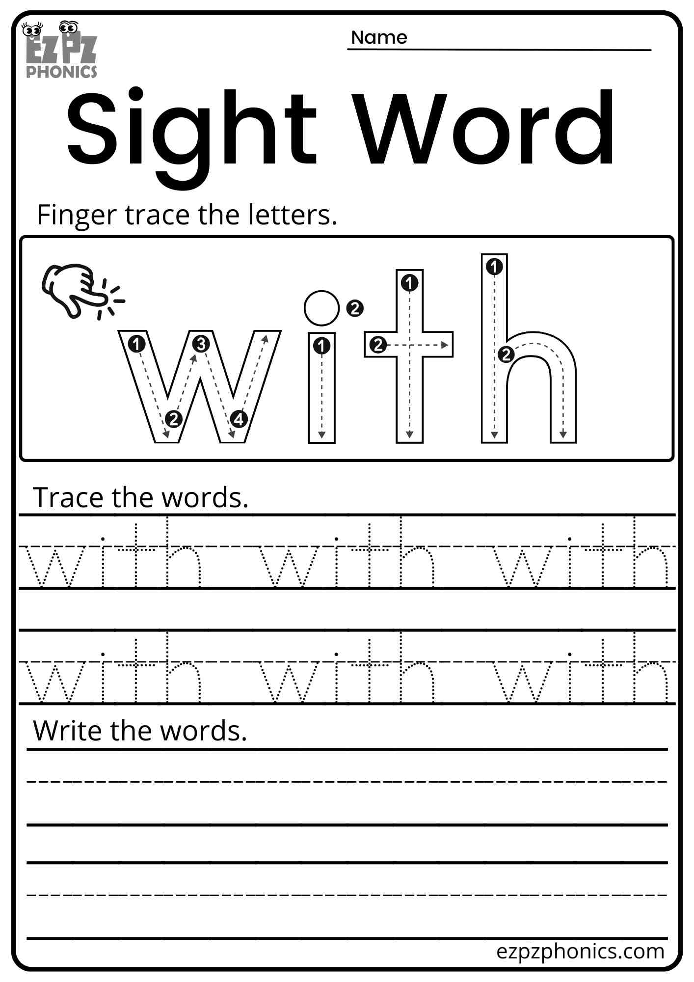 "With" Dolch Kindergarten Sight Word Worksheet Trace and Write the Words Activity PDF Download