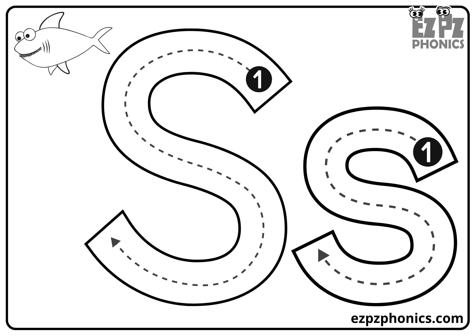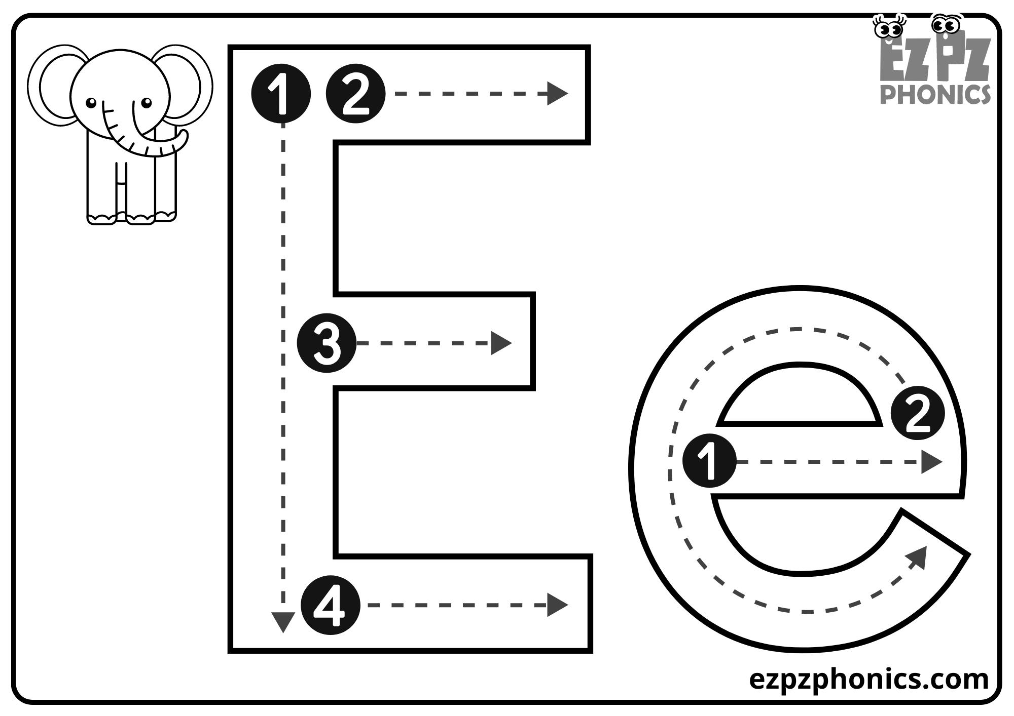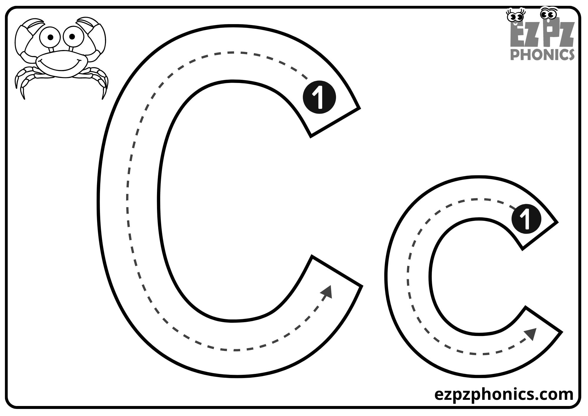 - Each card includes a large letter to trace, with arrows indicating the correct stroke order.