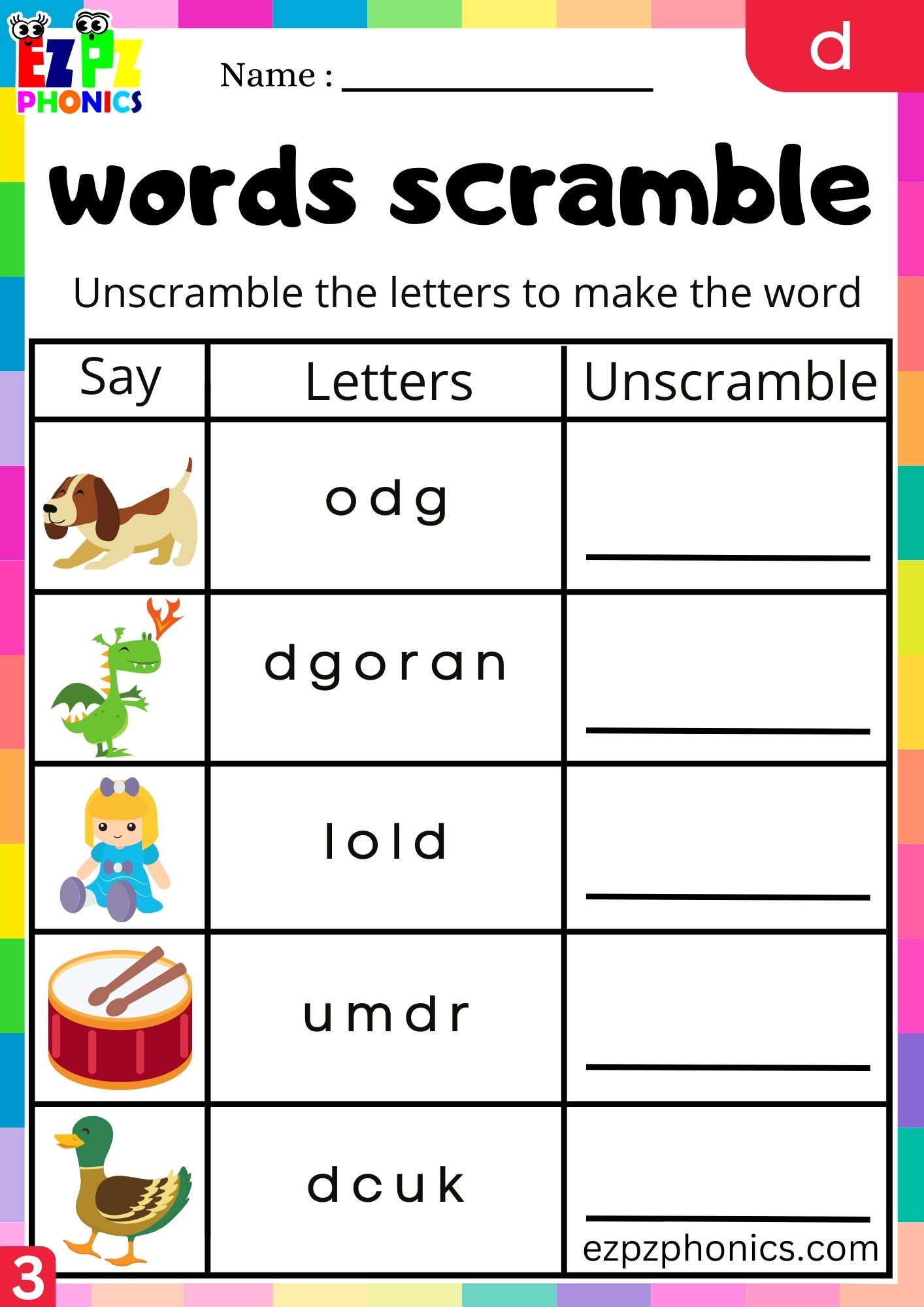 Letter d Word Scramble Phonics Activity for Kids Group 3